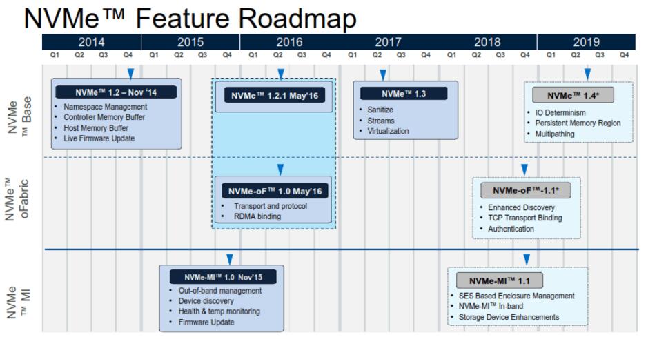 第一個NVMe規(guī)范逐漸增加了更新的功能——1.2版本中的實(shí)時固件更新和1.3版本中的清理功能已經(jīng)在SCSI和SATA中很常見了。明年年中推出NVMe 1.4版本將增加IO Determinism功能,以確?缇W(wǎng)絡(luò)和存儲的緊密且一致的延遲。同時,新增的管理規(guī)范也提供了管理設(shè)備機(jī)箱的能力。